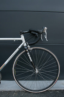 ENFIN!!! Encore une fois j'ai un peu trainé sur ce montage car la fourche Colnago qu'il y avait dessus ne me plaisait pas trop, et impossible de trouver une fourche Raymond Clerc...En désespoir de cause j'ai pris cette Look full charbon qui trainait au fond du garage (avec son jeu de direction qui va bien). Puis il fallait couper un peu le pivot...je coupe? je ne coupe pas? Je coupe?? ça a duré longtemps cette affaire...Et un jour bingo j'ai trouvé un groupe Dura Ace quasi complet, enfin surtout les manettes!!